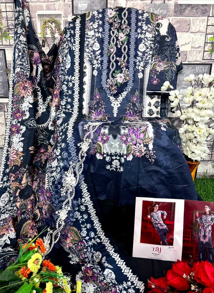 FABRIC DETAILS :- Top: Pure Cotton Print with heavy embroidery (with 2 patches)Bottam: Semi lawnDupatta: Silver chiffon / Cotton malTAJ CREATIONS 413 SALWAR SUITS MANUFACTURER
