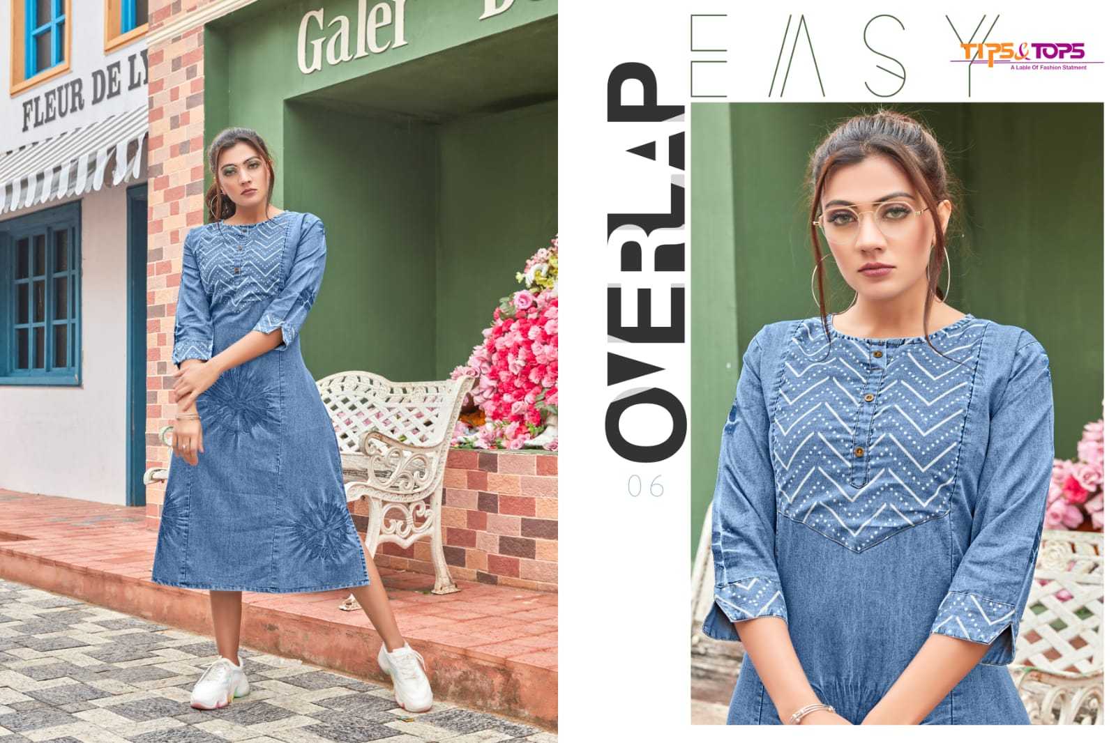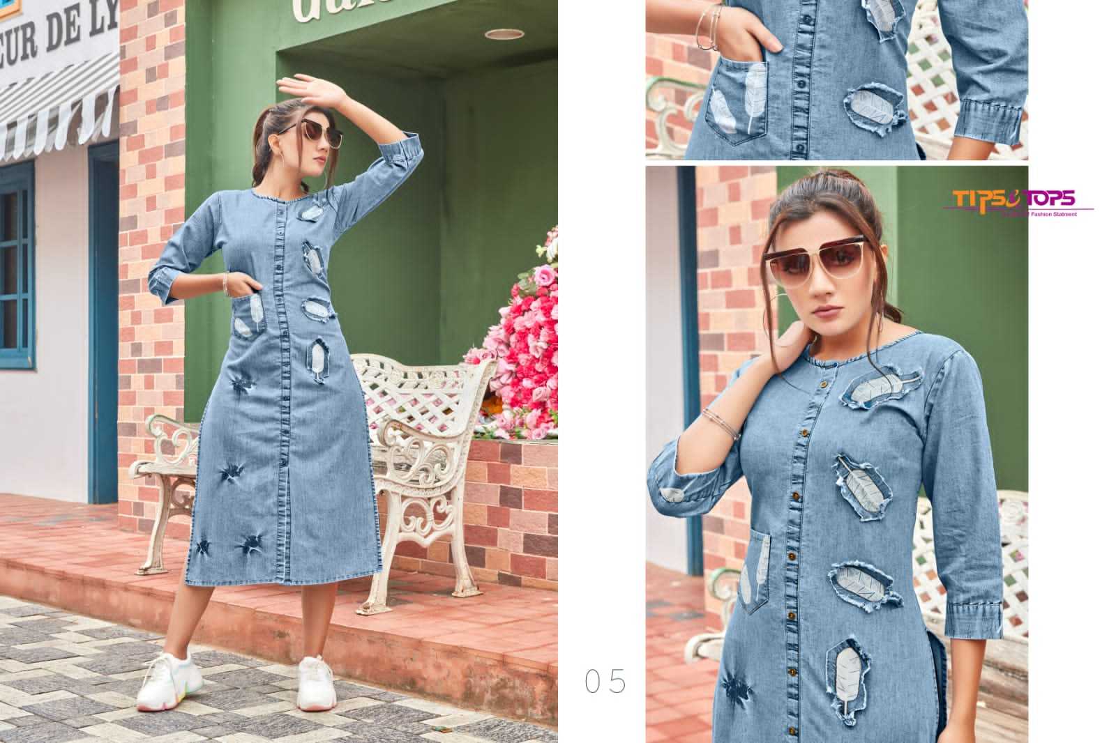 | DETAILS | Fabric : *Pure Cotton Denim* Specs : *Manual Work, Discharge Print and Washing Effects* Sleeves type : *3/4th* No.of designs : *6* Size : *S36, M38, L40 XL42* Length : *45"* |