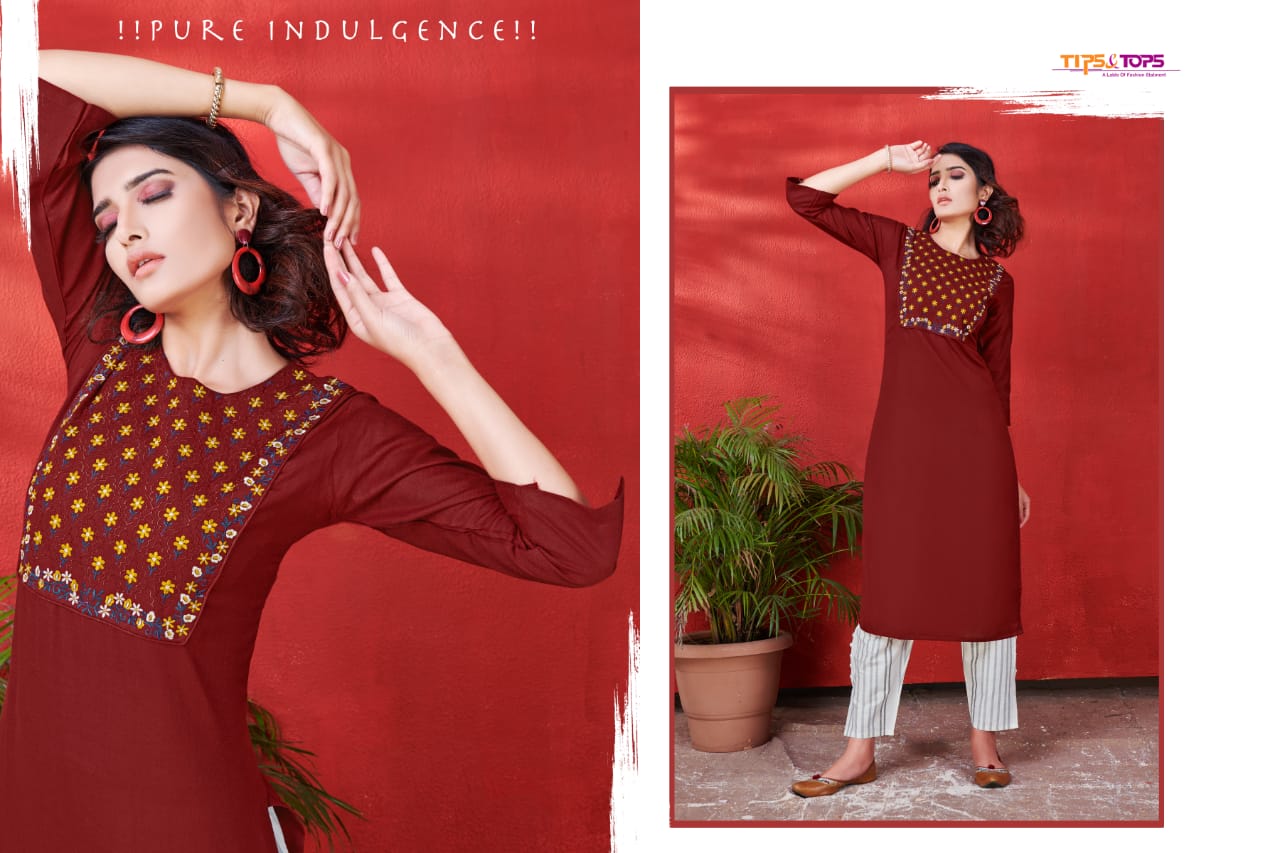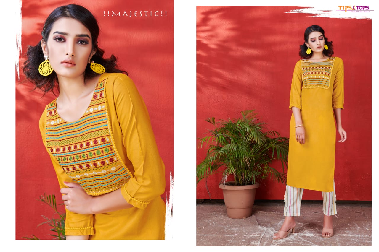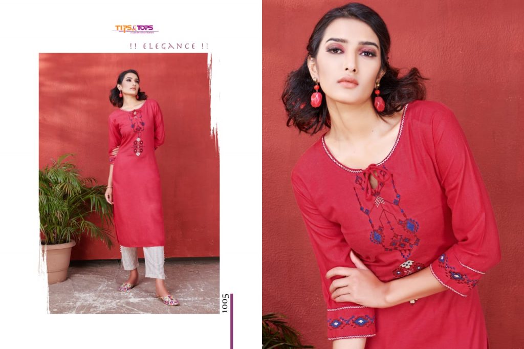| DETAILS | *NAMASTE* ?? *TIPS & TOPS* Catalouge : ? *MANNAT volume-5* ? *Party Wear Heavy Reyon Flex Kurtis with Pants* Fabrics : *Heavy Reyon Flex* with *embroidery* Bottom : *Yarn Dyed Cotton Stripes Pants* Rate : *595* + GST 5% *THANK YOU* ?? |
