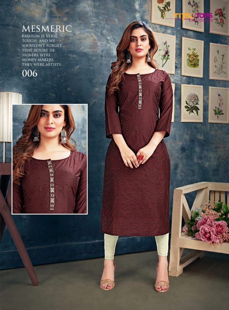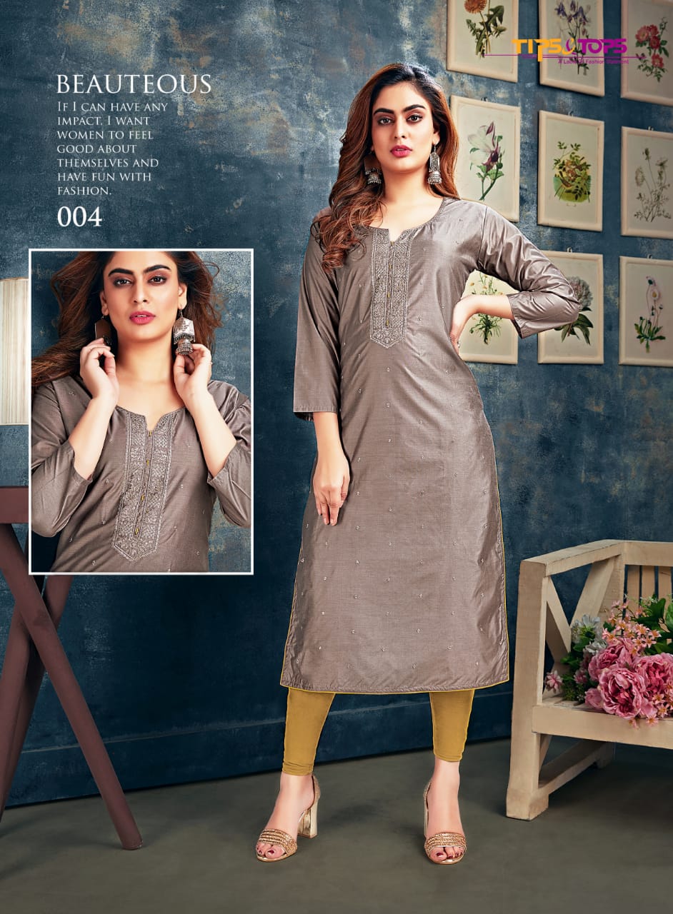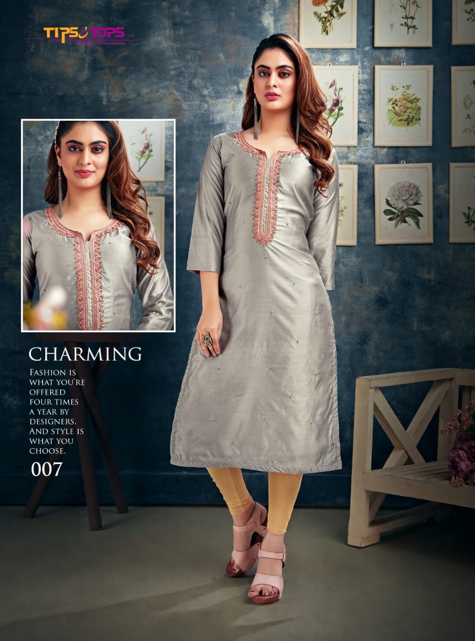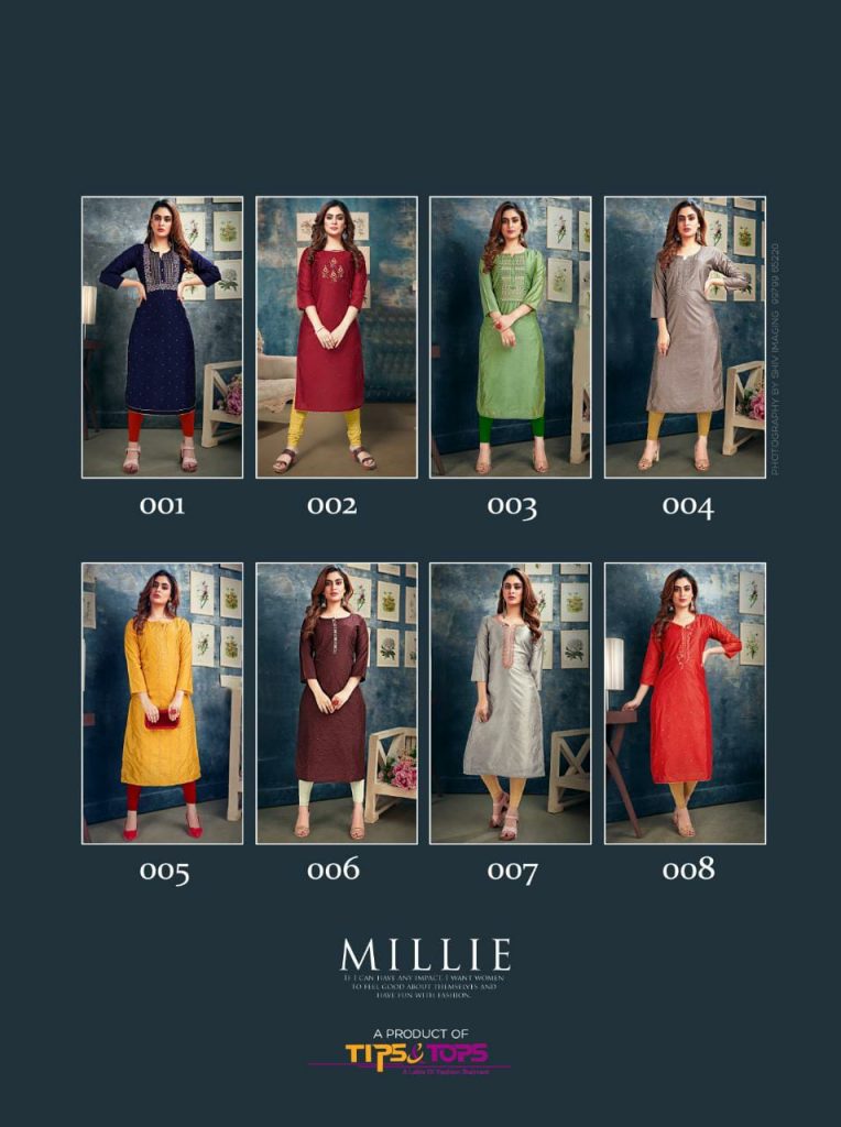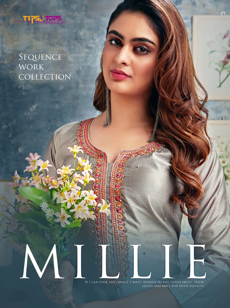 | DETAILS | *TIPS & TOPS* Catalouge : ? *Millie* ? *Fancy Straight Hand Worked and Sequence worked Silk Kurtis* Fabrics : *Premium Silk Chanderi* with *Cotton Inner* Rate : *655* + GST 5% *THANK YOU* ?? |