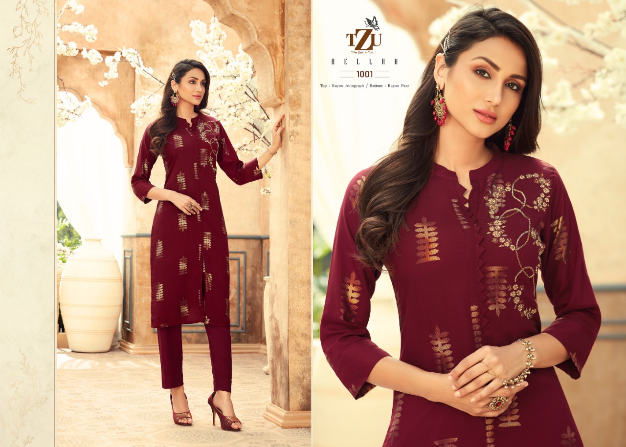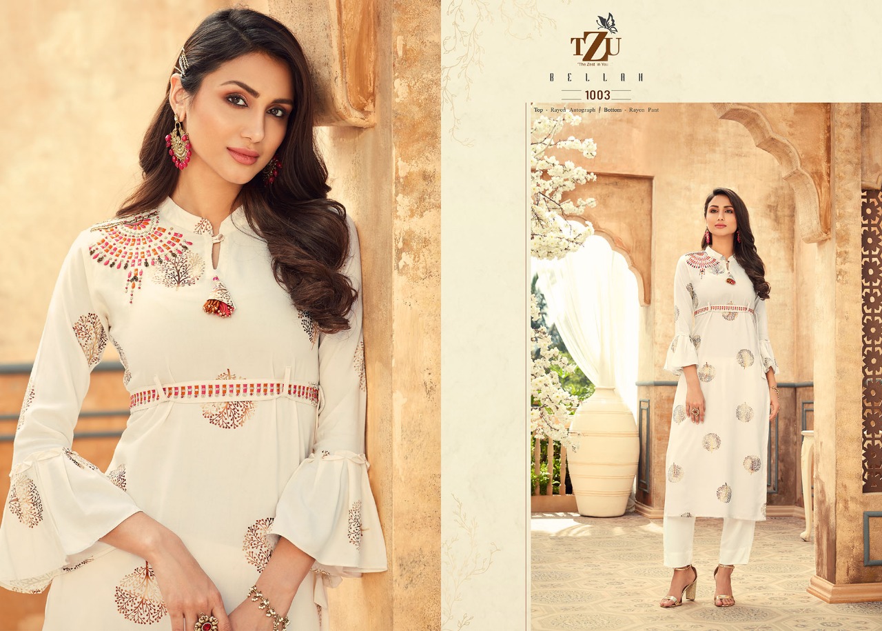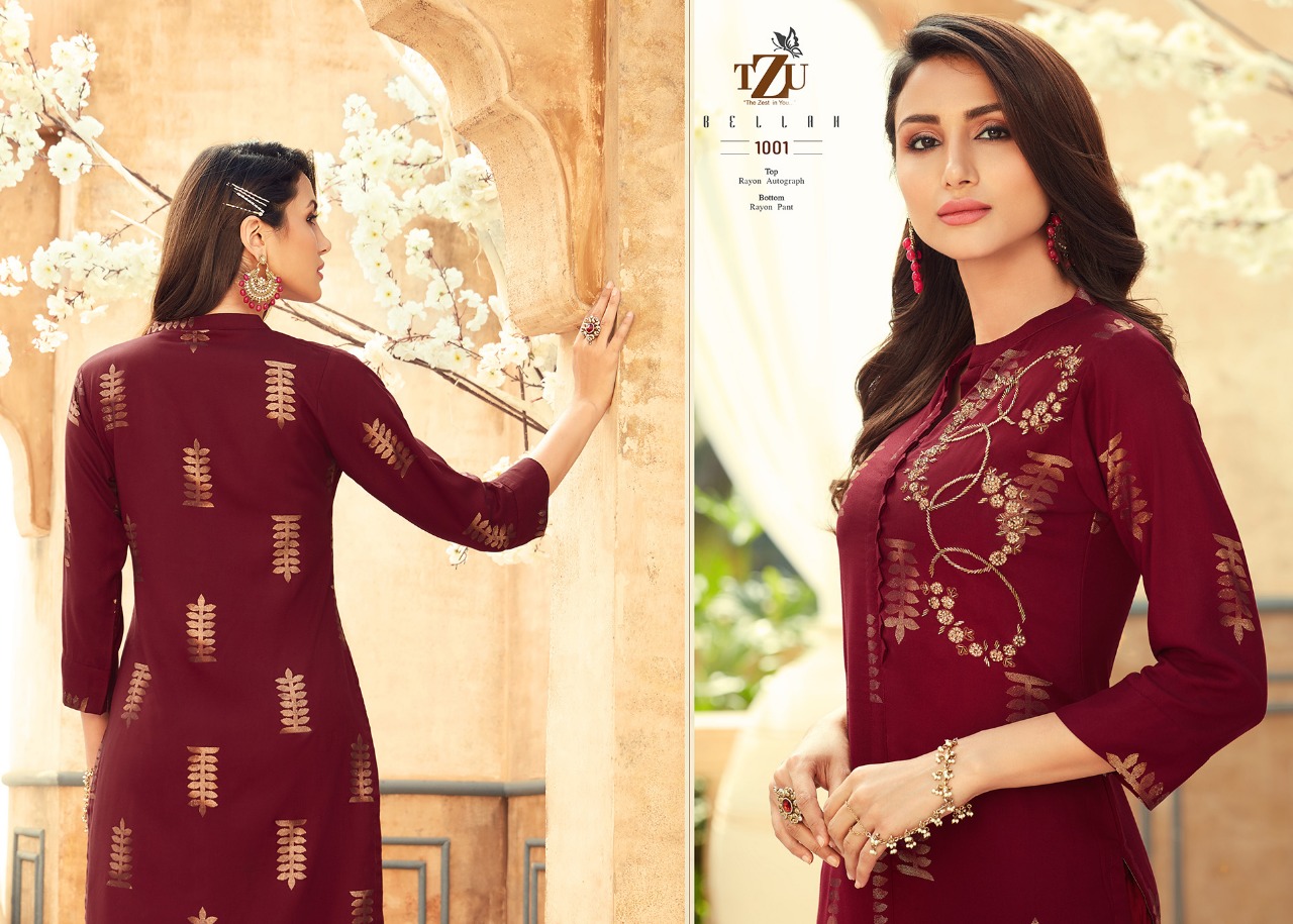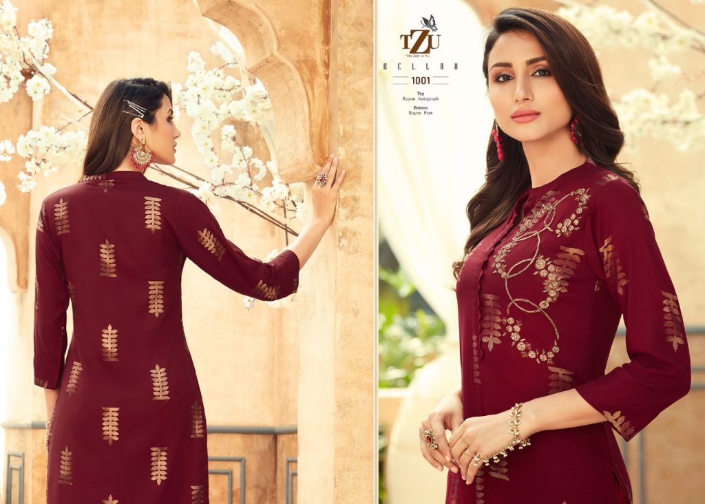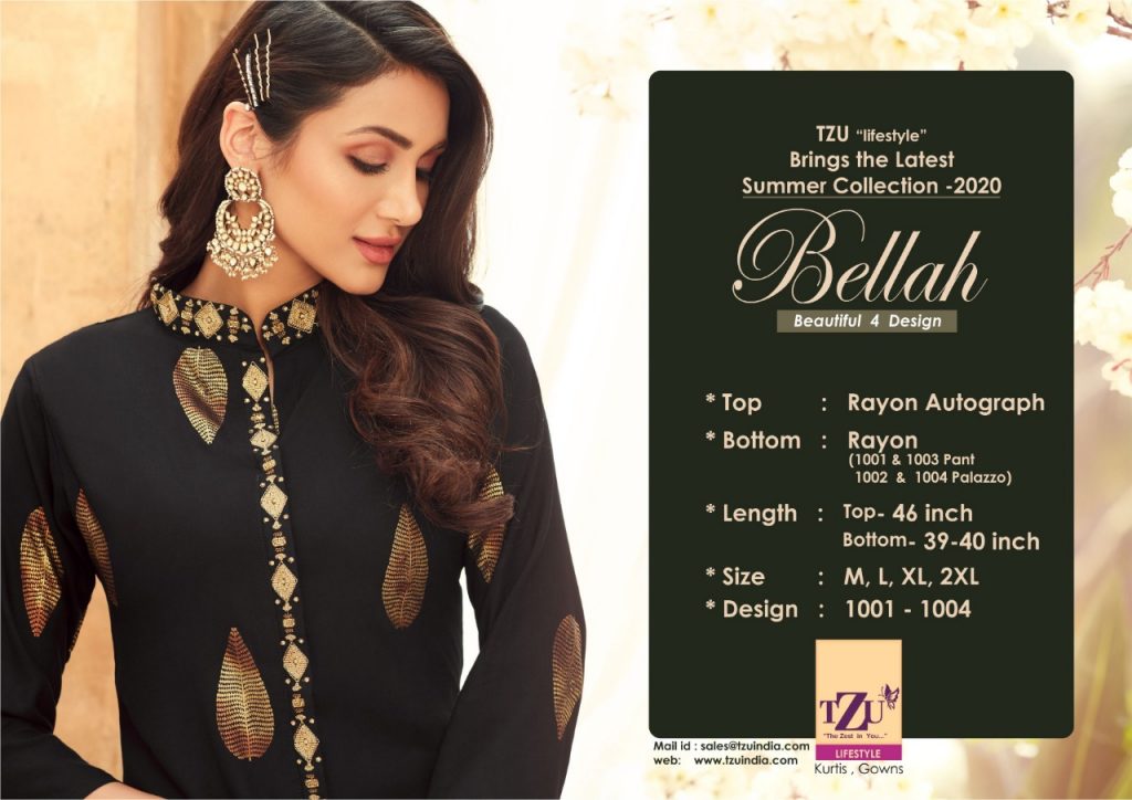 | DETAILS | TZU LIFE STYLE INTRODUCING- ??????????? BELLAH FABRIC :- RAYON PATTERN :-HAND WORK EMBROIDERY , FOIL PRINT TOP , WITH PANT SPEC. :- STRAIGHT CUT. LENGTH :- 46 INCH. DESIGNS :-1001 TO 1004 SIZES :-M,L,XL,2XL |