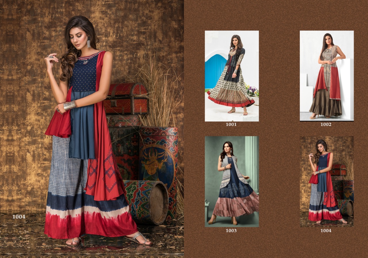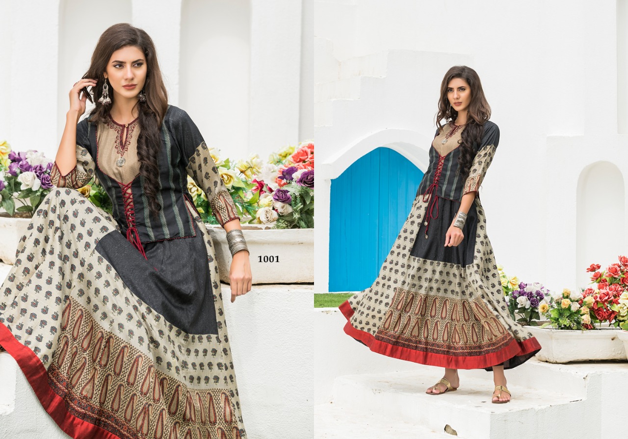 | DETAILS | FABRIC :- TUSSER SILK & MUSLIN PATTERN :- PRINTED WITH HAND WORK SPEC :- LONG ROUND CUT 1001 : ATECH SURG LENGTH :-56 INCH. DESIGNS :-1001 TO 1004 SIZES :-40, 42, 44 |