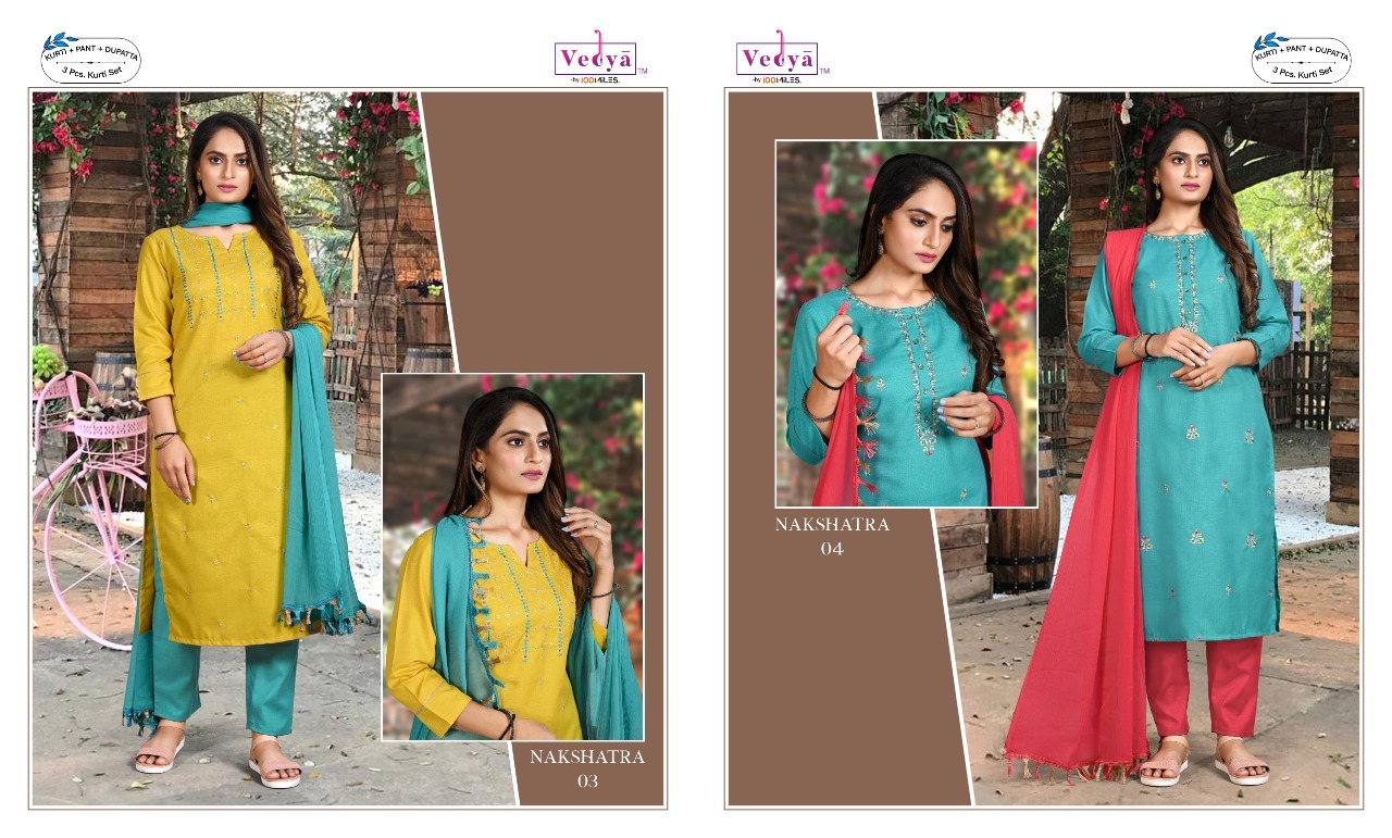 | DETAILS | ***Fabric Details:* *Brand -*VEDYA™️* ItemType- *3 Pcs Readymade Kurti Set (top+bottom+dupatta)*Catalog - *NAKSHATRA* Product Desc - PC Slub fabric *Embroidered* Kurti & Pant with Chiffon Heavy Lace DupattaSizes - S to 3XL Pieces - 6 per bag |