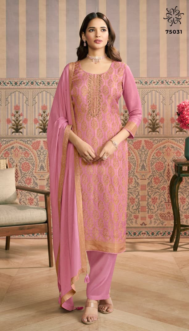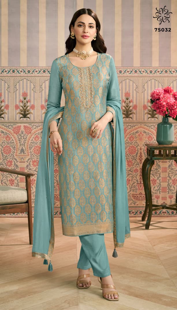 | DETAILS | **FABRIC DETAILS:- Top: Meena Touch Vis Simmer Jacquard with Exquisite Hand Work* -Bottom: Premium Soft Santoon* -Dupatta: Handworked Silk Georgette with Latkans & Elegant Four-Sided Border Lace* |