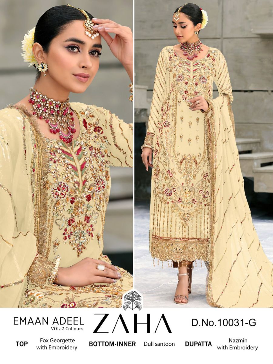 FABRIC DETAILS :- Top : GEORGETTE WITH HEAVY EMBROIDEREDBottom :SANTOONDupatta : NAZMIN HEAVY EMBROIDEREDINNER :- SANTOONZAHA 10031 G EMAAN ADEEL VOL 2 SALWAR SUITS