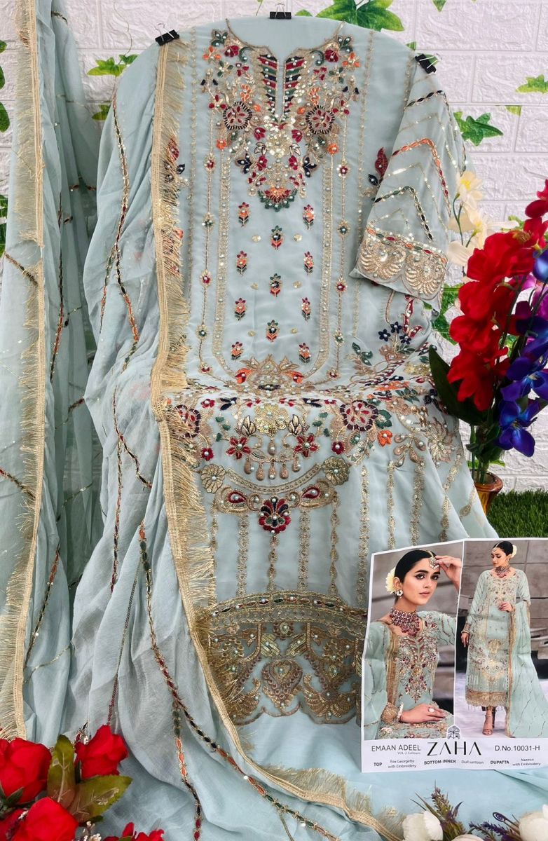 FABRIC DETAILS :- Top : GEORGETTE WITH HEAVY EMBROIDEREDBottom :SANTOONDupatta : NAZMIN HEAVY EMBROIDEREDINNER :- SANTOONZAHA 10031 H EMAAN ADEEL VOL 2 SALWAR SUITS