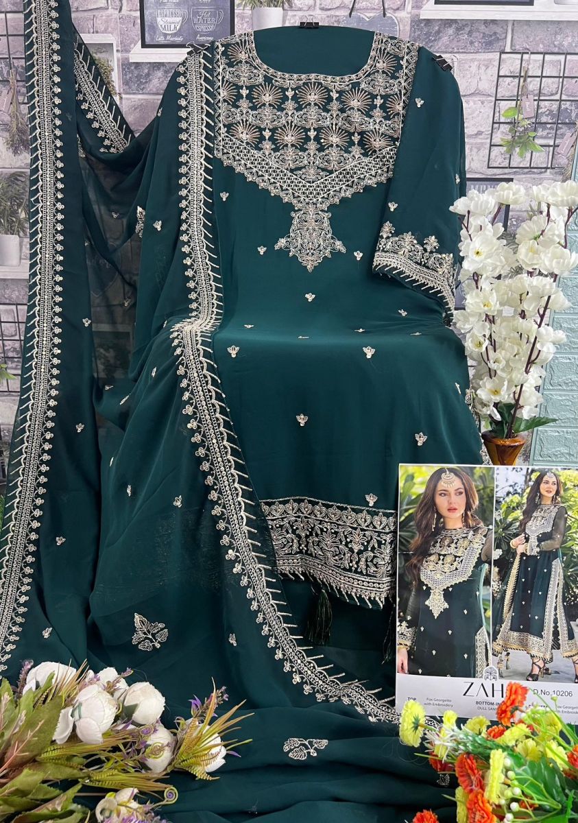 FABRIC DETAILS :- Top : GEORGETTE WITH HEAVY EMBROIDEREDBottom :SANTOONDupatta : FOXJORGET WITH HEAVY EMBROIDEREDINNER :- SANTOONZAHA 10206 PAKISTANI SUITS MANUFACTURER