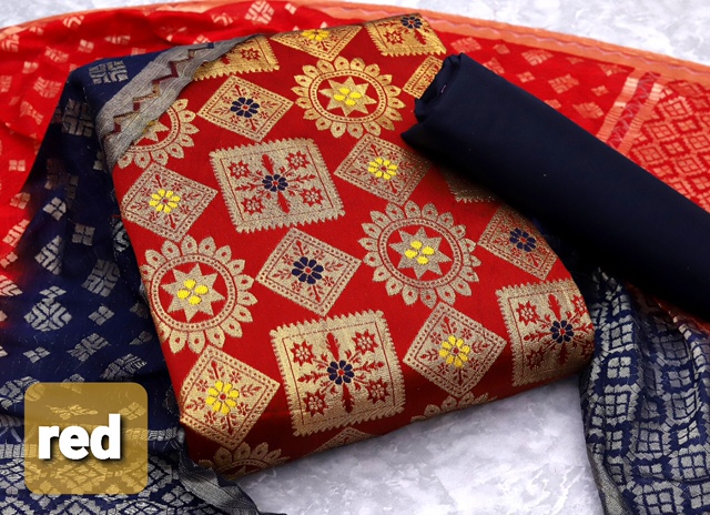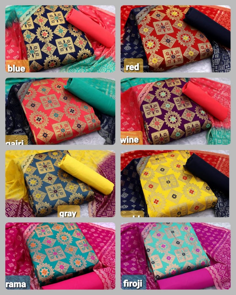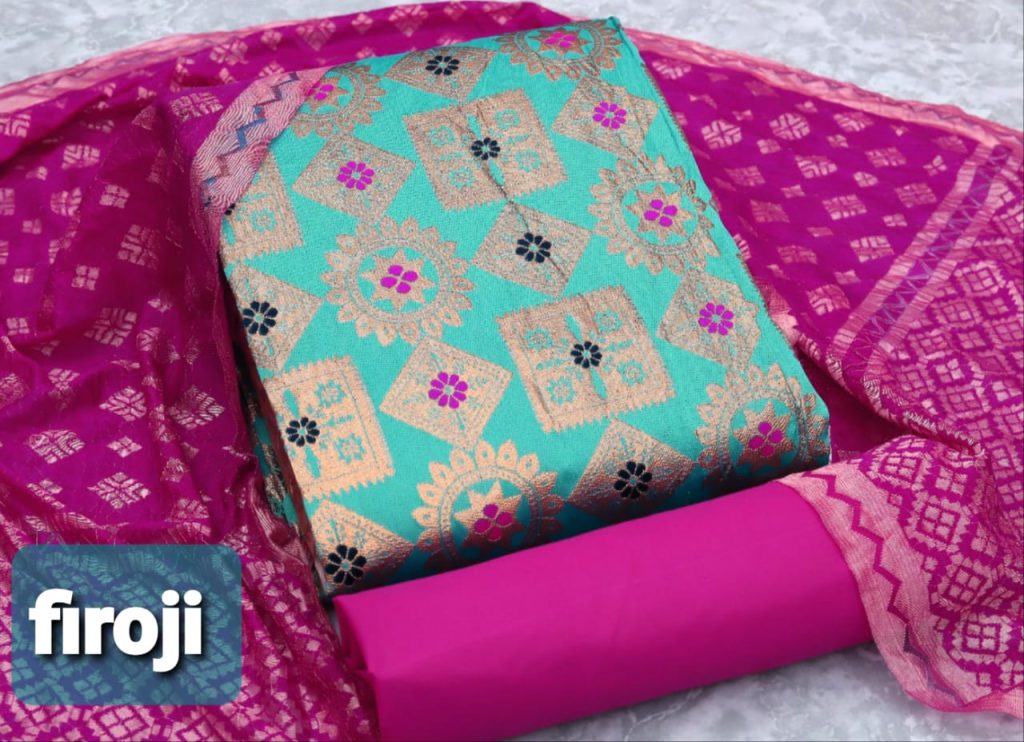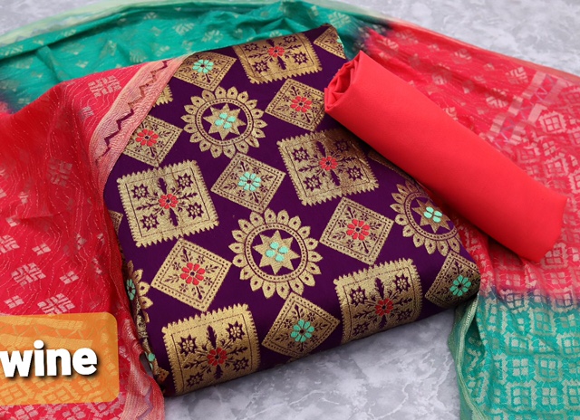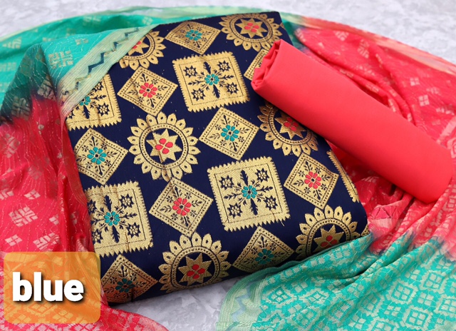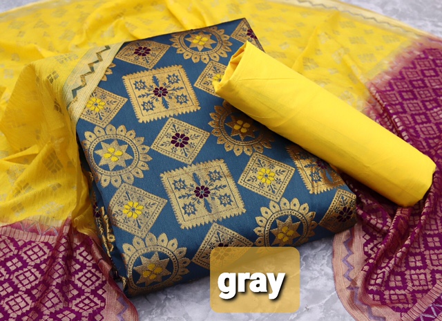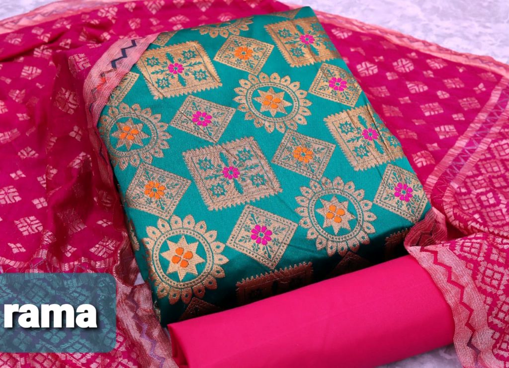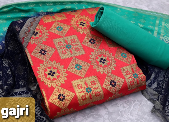 | DETAILS | TOP : BANARASI SILK (2.50 MTR)* ?*BOTTOM : COTTAN ?*DUPATTA : JECQUARD WEAVING (2.20 MTR)* |