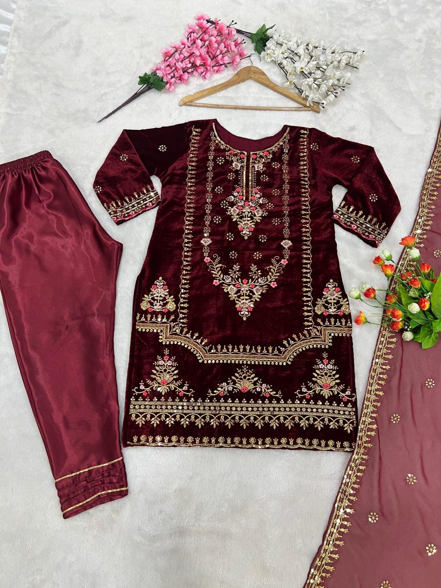 | FABRIC DETAILS | Top Fabric :Heavy Viscose Velvet With Heavy 5mm Embroidery sequence Work With SleevesTop Inner : Micro Cotton Top Size : XL(42) With XXL(44) Margin (Fully Stitched Completely Ready To Wear) Top Length : 37-38 InchesBottom Fabric : Silk with ( Full Stiched)Dupatta Fabric : Heavy Georgette With Embroidery Sequence Work with lace border |