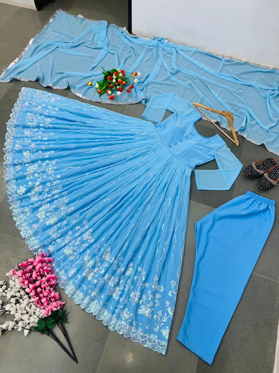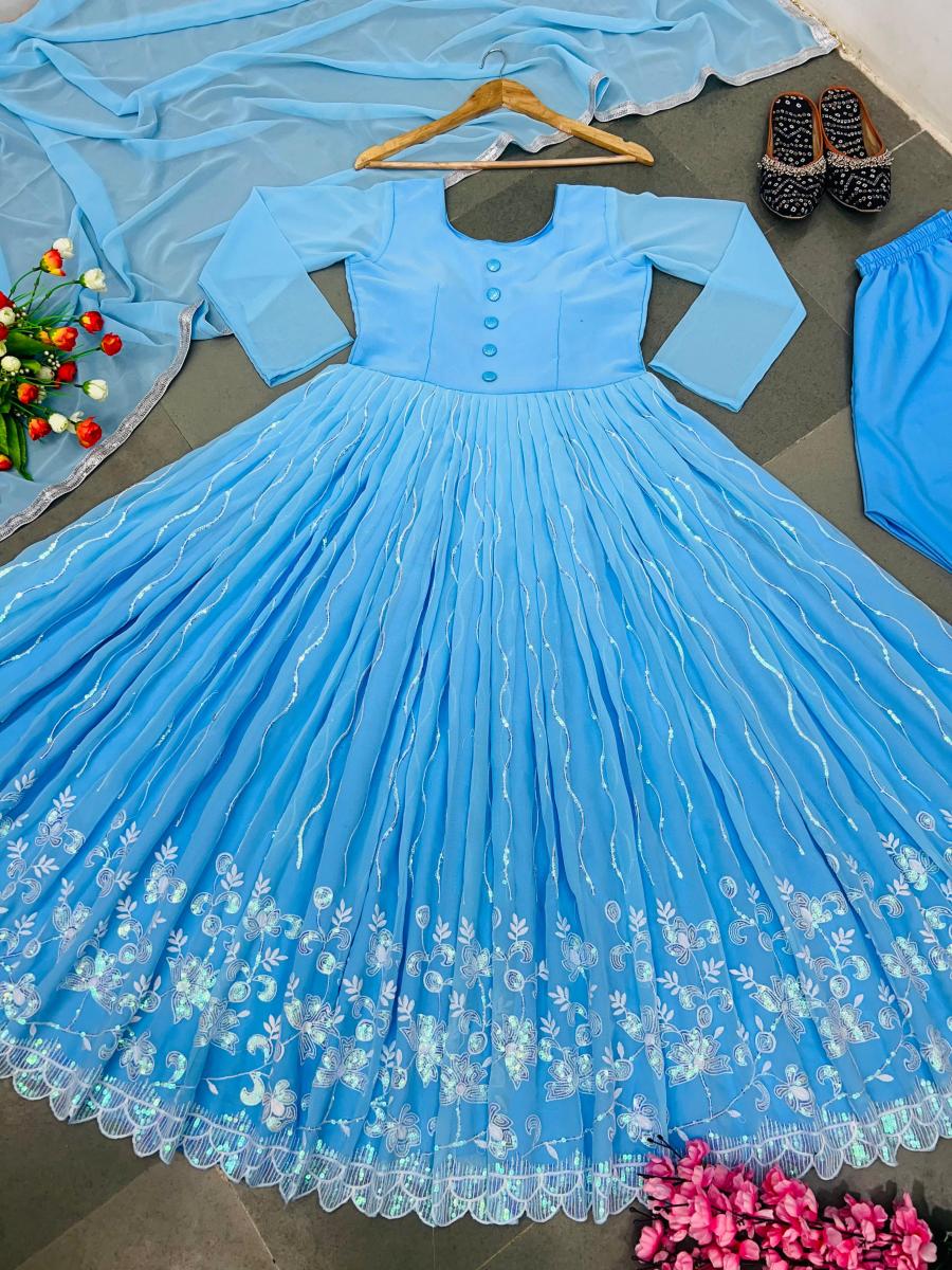 | FABRIC DETAILS | Gown Fabric :Faux Georgette With Full Heavy Embroidery Sequence Work With Full Sleeve and Attached Pad With Extra ButtonGown Inner : Micro Cotton