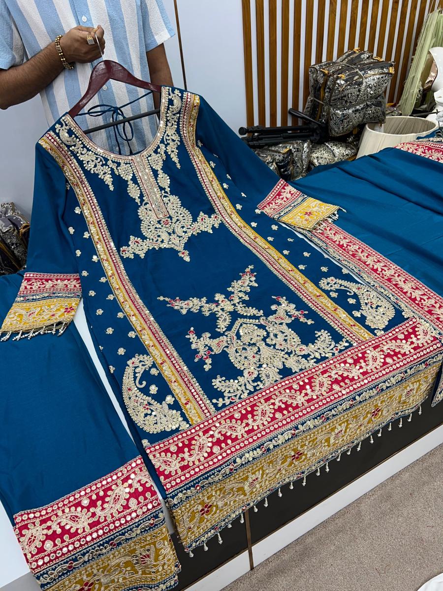 | FABRIC DETAILS | Top Top Fabric :Pure Chinnon Silk With Heavy Embroidery Cording Sequence Work And Full SleeveTop Inner :Heavy Micro Cotton Top Length : 46-47 Inch Top Size. : M(38),L(40), Xl(42), Xxl(44) (FULLY STITCHED READY TO WEAR) Pent Pent Fabrics :Pure Chinnon Silk With Embroidered Cording Sequence Work (Full stitched) Pent Length:40-41 Inch (fully stitched) Dupatta Dupatta Fabric :Pure Chinnon Silk With Embroidery Cording Sequence Work With Lace Border |