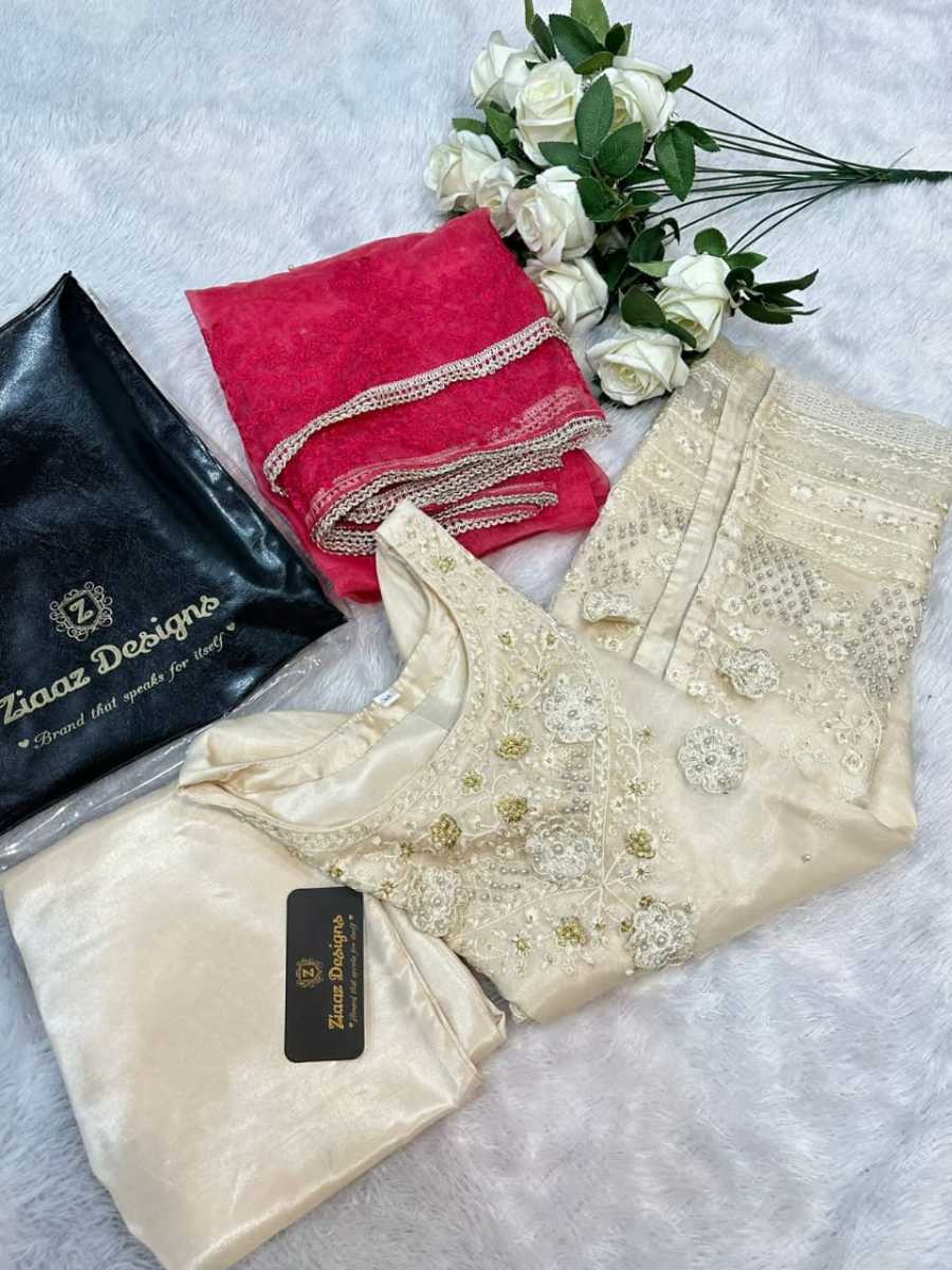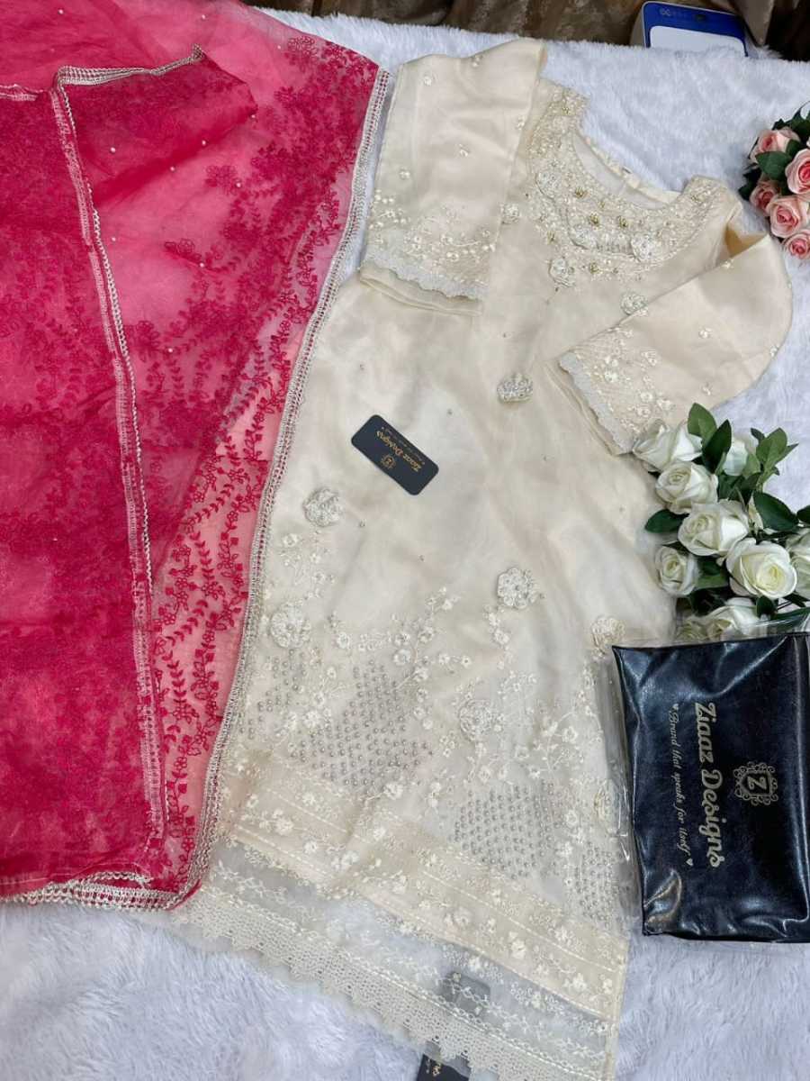 FABRIC DETAILS :- Organza very heavy handwork and embroidered outfit semi stitched with santoon inner and bottoms unstitched with embroidery on front portion of bottoms and Organza cutwork embroidered dupattaZIAAZ DESIGNS 267 NOOR GOLD PAKISTANI SUITS