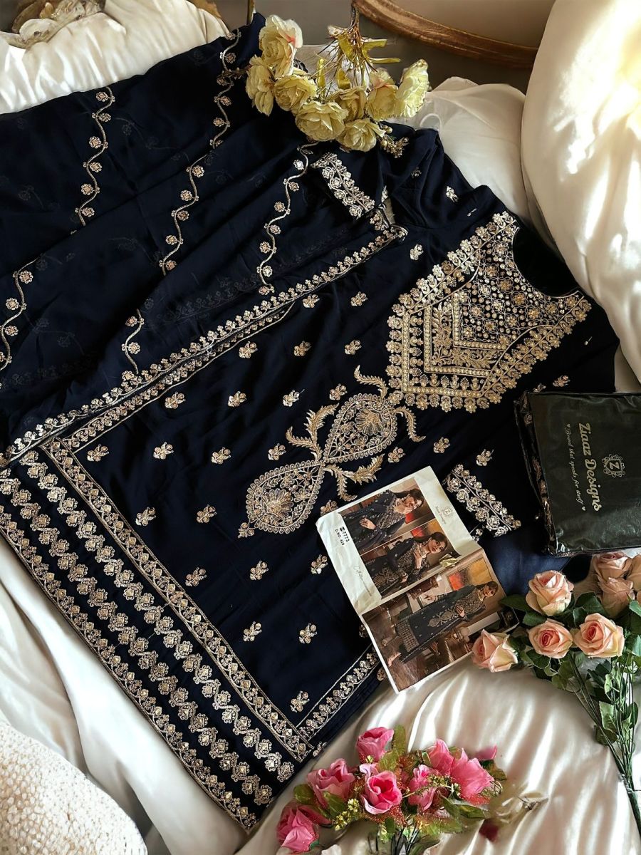 | FABRIC DETAILS | Georgette very heavy embroidered very beautiful dark navy blue semi stitched outfit with embroidered back as well unstitched santoon inner and bottoms. beautiful georgette embrdroidered heavy dupatta |