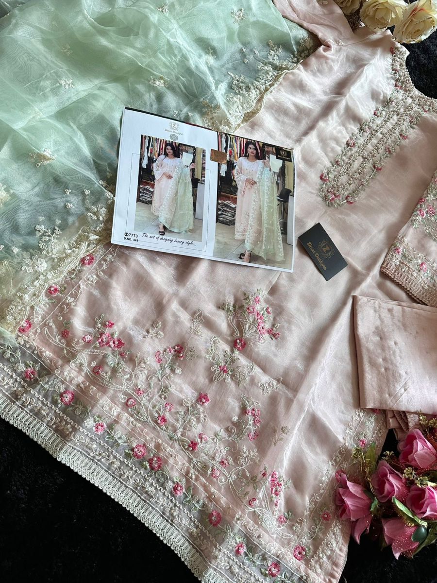 | FABRIC DETAILS | Organza embroidered very beautiful shade pastel peachy pink with mint green contrast dupatta semi stitched outfit with handwork unstitched santoon inner and bottoms. Organza embrdroidered heavy border work dupatta |