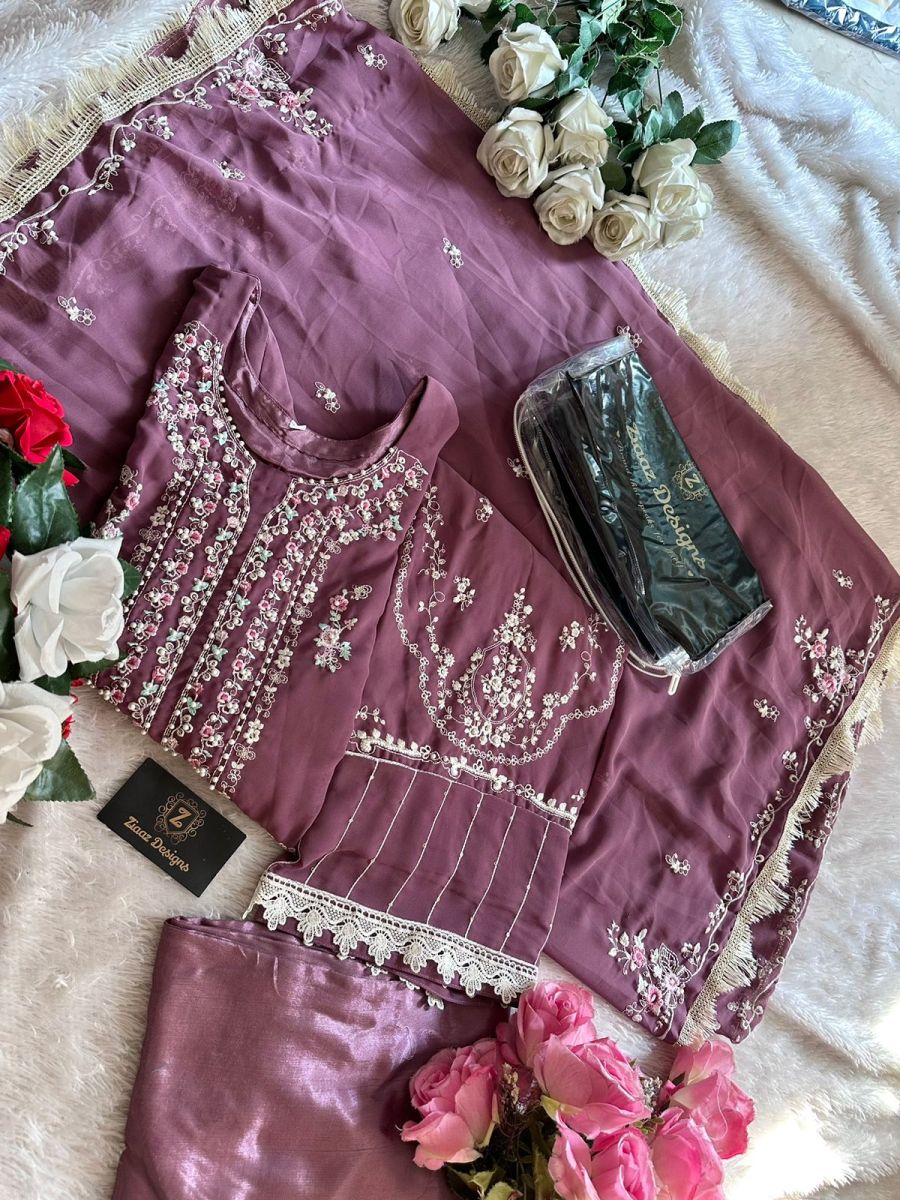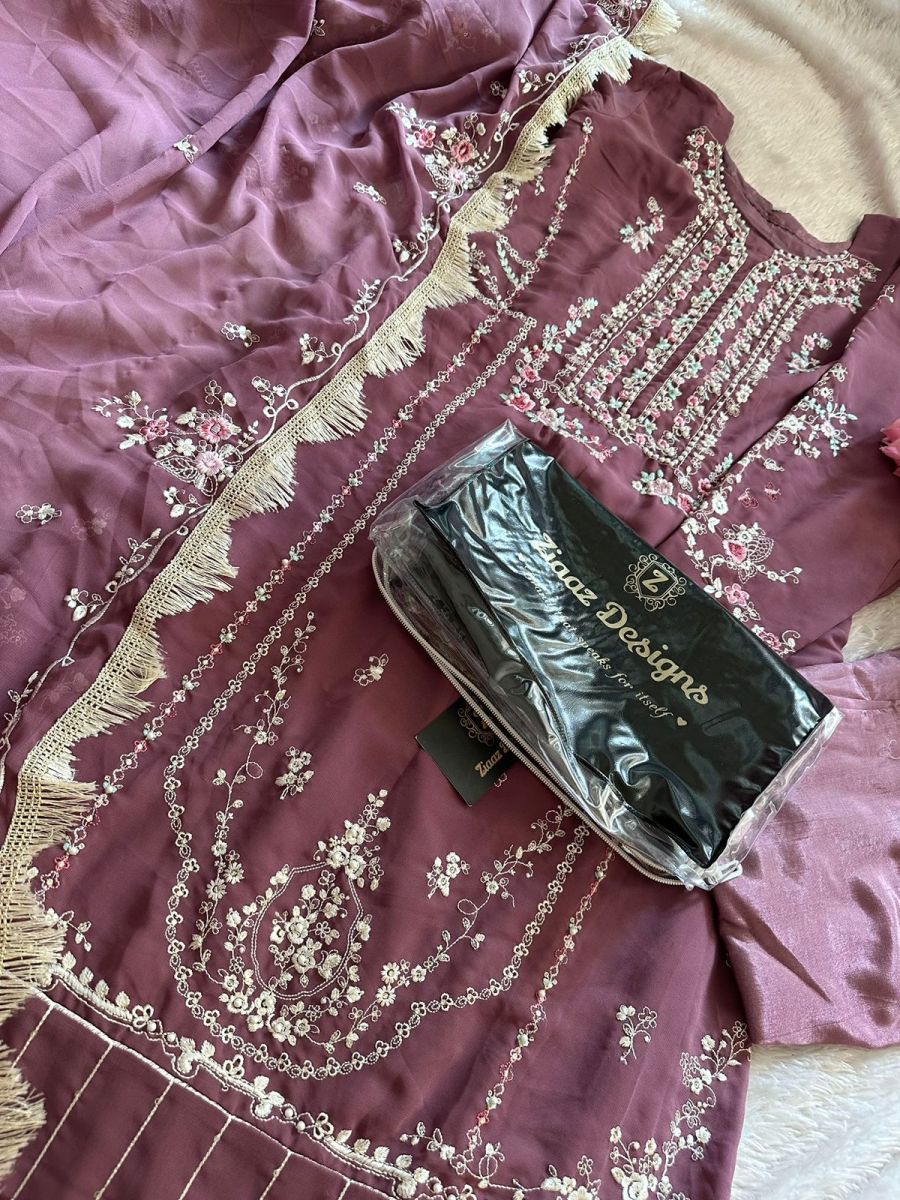 | FABRIC DETAILS | Georgette shaded very heavy embroidered very beautiful pastel shade moti work semi stitched outfit unstitched santoon inner and bottoms. Georgette fine embroidered dupatta with lace. |
