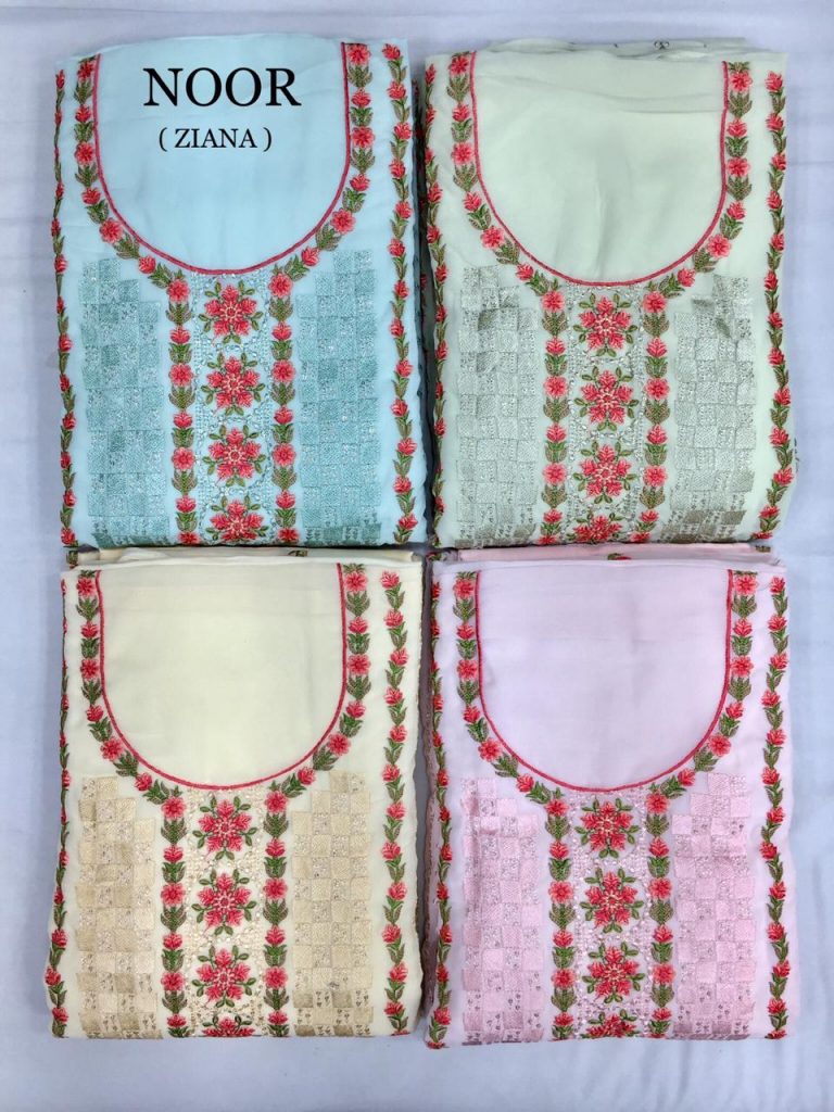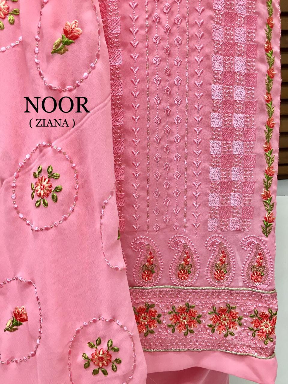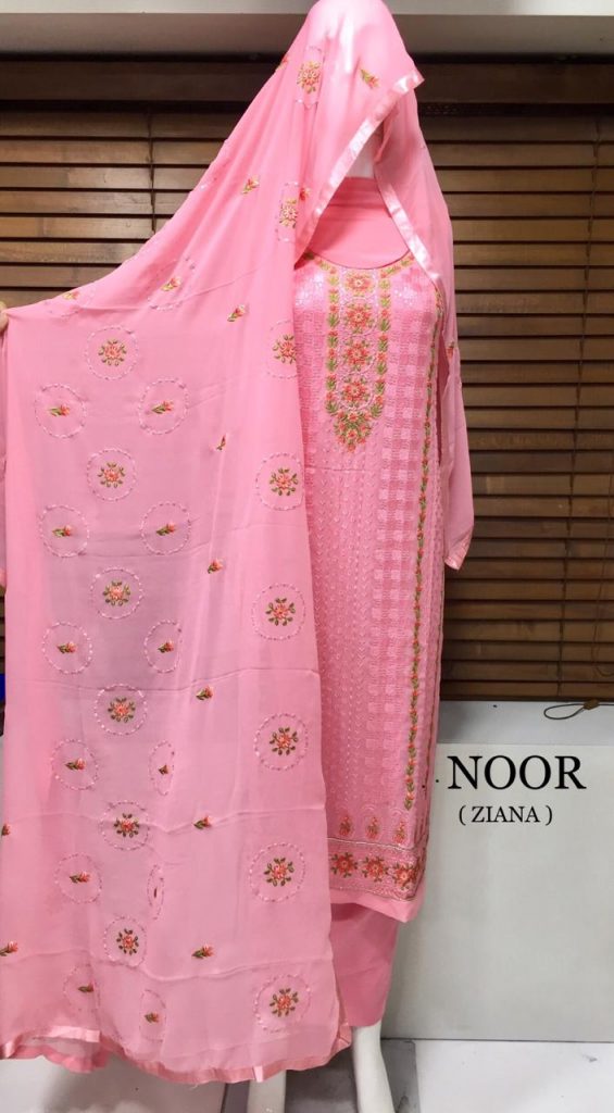 | DETAILS | Top (2.50 metres) : Pure heavy Georgette with full front embroidery work + Diamond Work Dupatta (2.25 metres) : Pure heavy Georgette with four side heavy embroidery lace patti + Diamond work. Bottom + Inner (4.25 metres) : Heavy Dull Santoon |