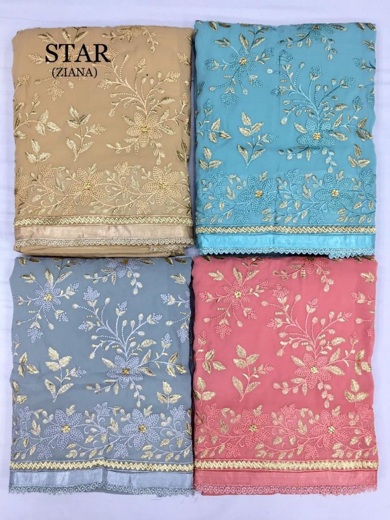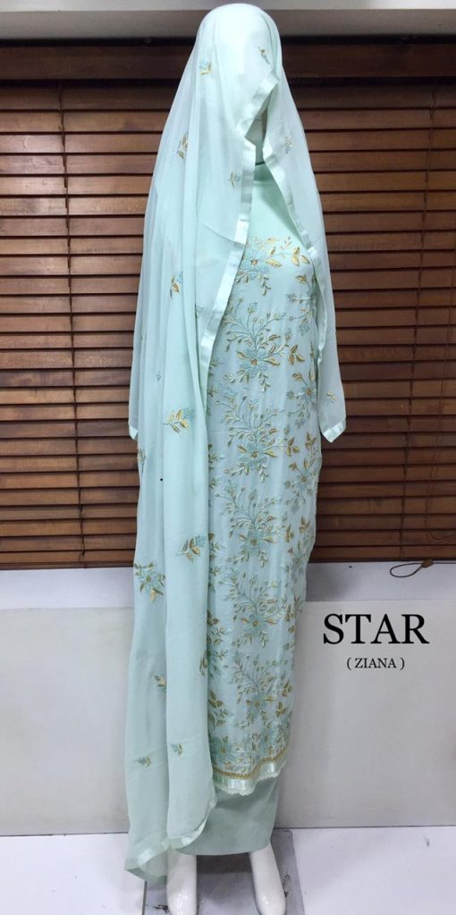 | DETAILS | Top (2.50 metres) : Pure heavy Georgette with full front embroidery work + Diamond Work Dupatta (2.25 metres) : Pure heavy Georgette with four side heavy embroidery lace patti + Diamond work. Bottom + Inner (4.25 metres) : Heavy Dull Santo |