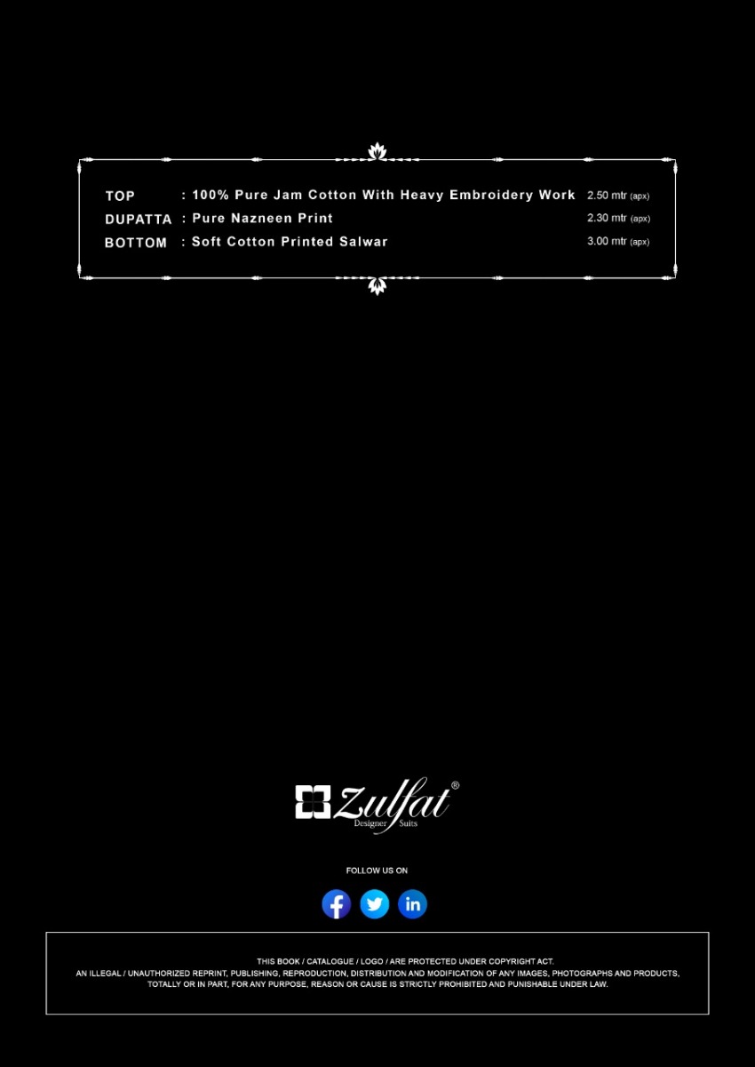 | DETAILS | *FABRIC** Top: 100% Pure Heavy Jam Cotton with Heavy Embroidery (2.50 mtrs) Dupatta: Pure Nazneen Chiffon (2.30 mtr) Bottom: Pure soft cotton print salwar (3 mtrs apx)Pcs: 10 |