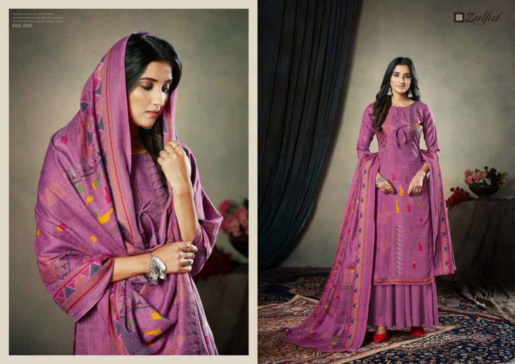 | DETAILS | # Winter Affair *”Zulfat Designer Suits”* Presents *”WINTER AFFAIR”* ? Top: 100% Pure Pashmina Digital Style Print (2.50 mtrs) ? Dupatta: Pure Pashmina Shawl with four side lace (2.30 mtr) ? Bottom: Pure Pashmina Spun (3 mtrs apx) ?Pcs: 10 ?Rate: 395/- (GST extra) # Book Now |