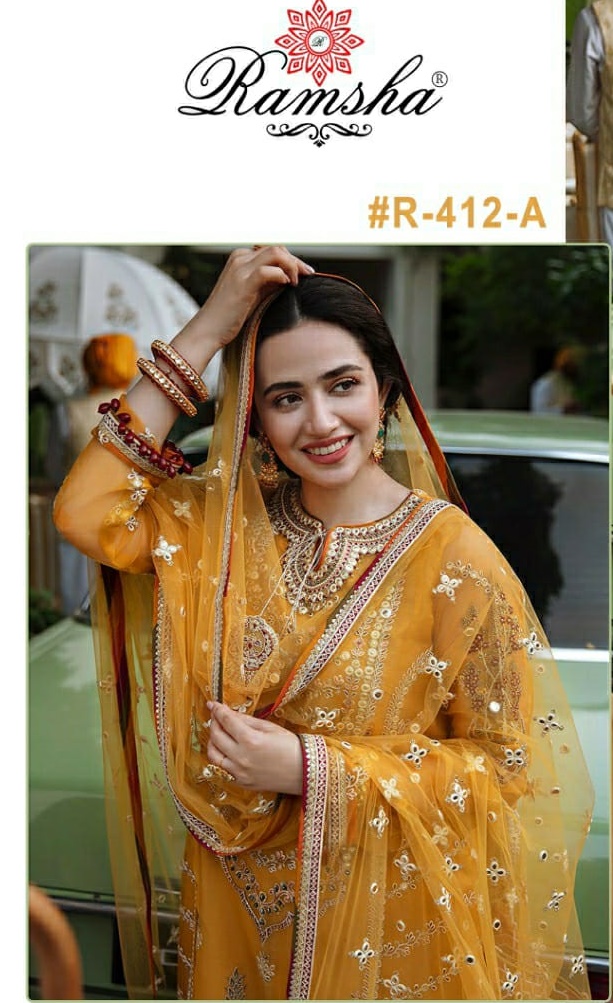 RAMSHA R 412 NET WITH EMBROIDERY PAKISTANI SUITS AT WHOLESALE
