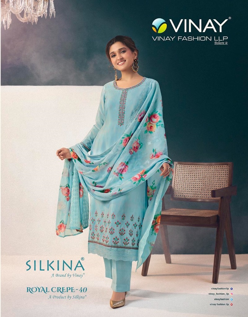 VINAY SILKINA ROYAL CREPE VOL 40 DIGITAL PRINT EMBROIDERY SUITS WHOLESALER